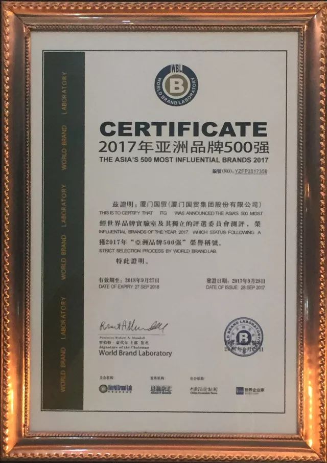 由世界品牌實(shí)驗(yàn)室和世界經(jīng)理人集團(tuán)共同編制和發(fā)布的2017年《亞洲品牌500強(qiáng)》排行榜于9月28日在香港揭曉, 這是世界品牌實(shí)驗(yàn)室第十二次對亞洲品牌的影響力進(jìn)行的測評, 共有20個(gè)國家和地區(qū)的500個(gè)品牌入選。本年度《亞洲品牌500強(qiáng)》排行榜中,共有來自金融、食品飲料、電子電器、傳媒、通信電子IT等在內(nèi)的37個(gè)相關(guān)行業(yè)的品牌入選。廈門國貿(mào)集團(tuán)股份有限公司首次進(jìn)入這個(gè)榜單,位列本次亞洲品牌500強(qiáng)榜單第358位。