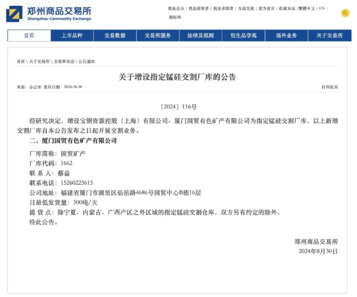 國貿(mào)有色礦產(chǎn)獲批鄭商所錳硅交割廠庫資質(zhì)