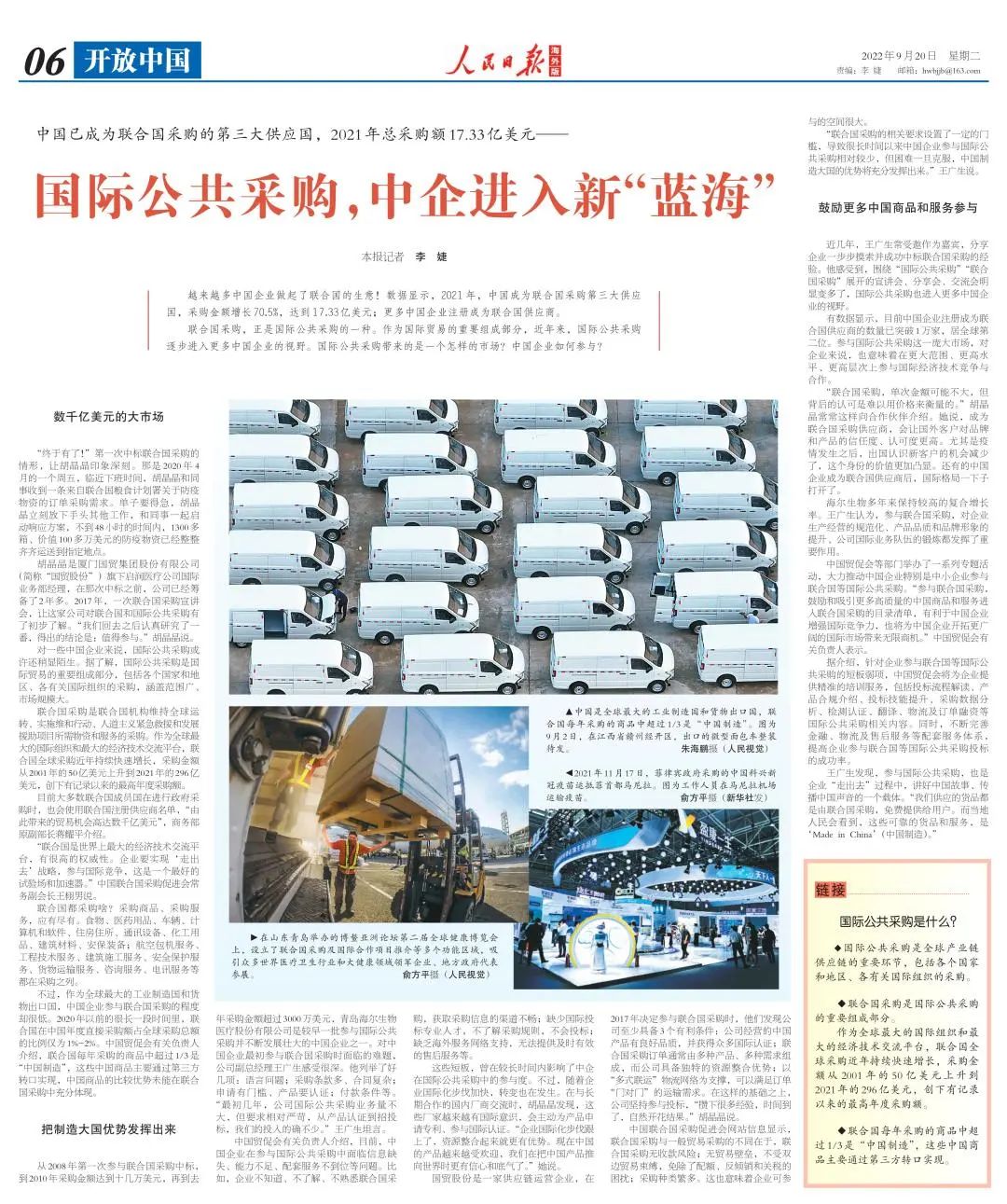 《人民日報》(海外版)刊發(fā)《國際公共采購,中企進(jìn)入新“藍(lán)?!薄芬晃模稍L國貿(mào)股份旗下啟潤醫(yī)療公司國際業(yè)務(wù)部副總經(jīng)理(主持工作)胡晶晶,并以國貿(mào)股份為例,展現(xiàn)國際公共采購的潛在市場與貿(mào)易機(jī)遇。