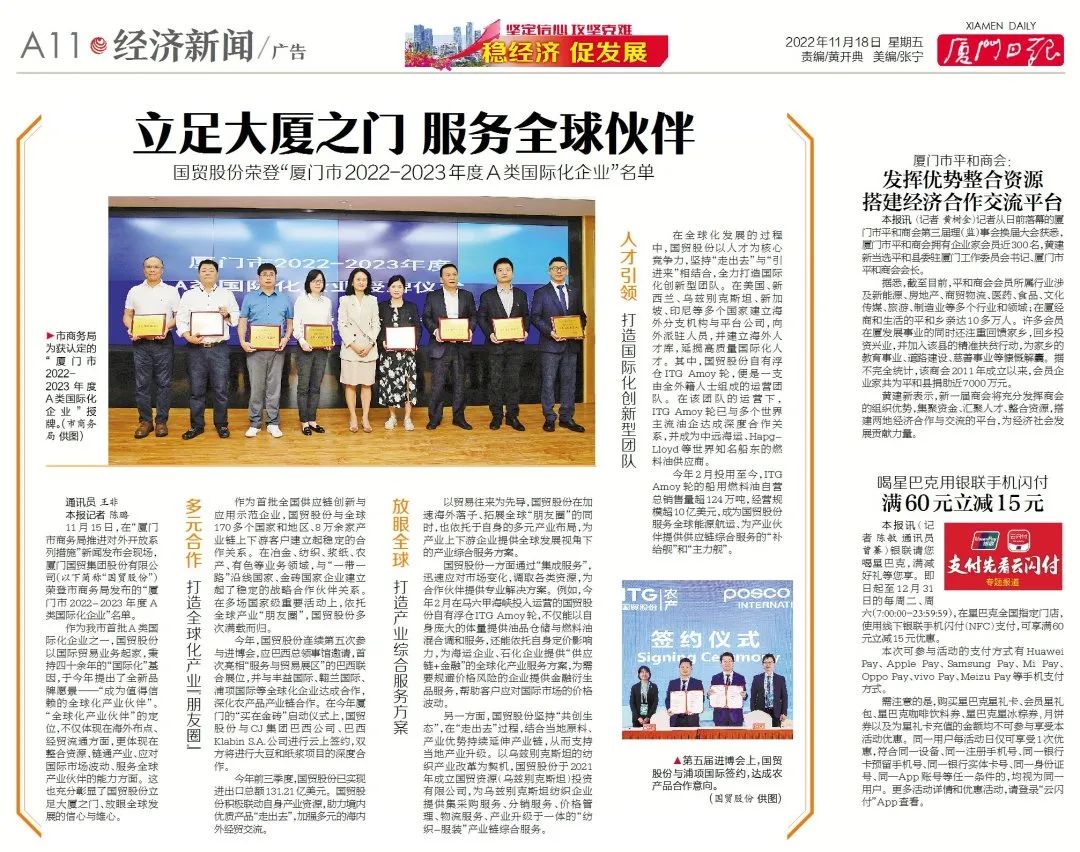 廈門日報 | 國貿(mào)股份榮登“廈門市2022-2023年度A類國際化企業(yè)”名單